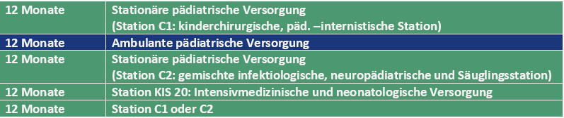 Die zeitliche Gliederung der Verbundweiterbildung sieht vor, dass die angehenden Fachärztinnen und Fachärzte ihre fachärztliche Ausbildung an der Universitätsklinik für Kinder- und Jugendmedizin beginnen und fließend, das heißt ohne Unterbrechung dieser Ausbildung, in die Praxis rotieren, dort ein Jahr der Ausbildung absolvieren, um dann an die Klinik zurückzukehren und die fachärztliche Ausbildung zu vollenden.
