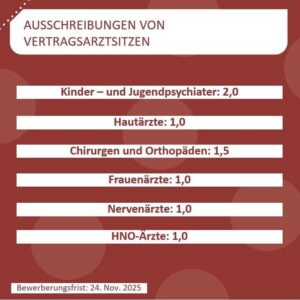 Immer zum Monatswechsel veröffentlicht die Kassenärztliche Vereinigung Saarland eine Liste mit Arztsitzen/Psychotherapeutensitzen. Zuständig dafür ist der Zulassungsausschuss, der auch über das ganze Zulassungsverfahren entscheidet. Aktuell
